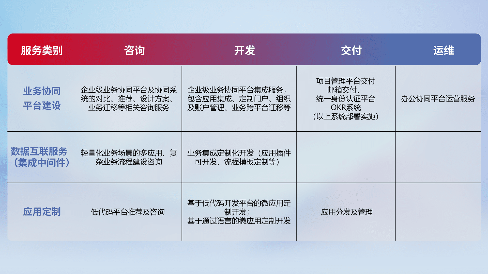 针对钉钉、、、企微、、、IDaas等平台级产品提供产品的规划、、、、方案、、交付、、、、定制化开发等服务,,,实现如统一协同办公、、智能客户服务、、、、混合会议管理、、、智能数据查询、、等业务场景,,实现数字化转型。。。。