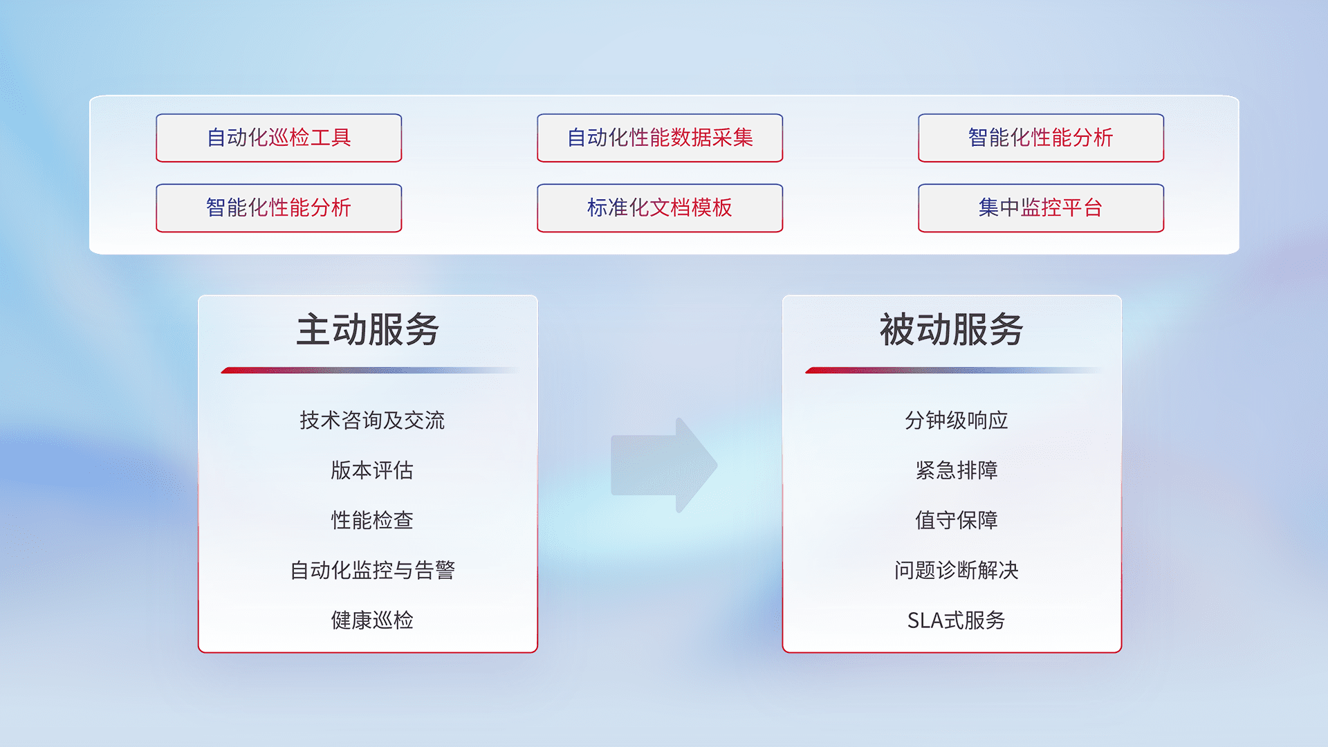 智能化工具和标准化文档,,,保障服务质量,,,,提供主动服务(包含技术咨询、、版本评估、、、、性能检查、、、自动化监控与告警、、、健康巡检)和被动服务包含(分钟级响应、、紧急排障、、、值守保障、、问题诊断解决、、SLA服务)。。。