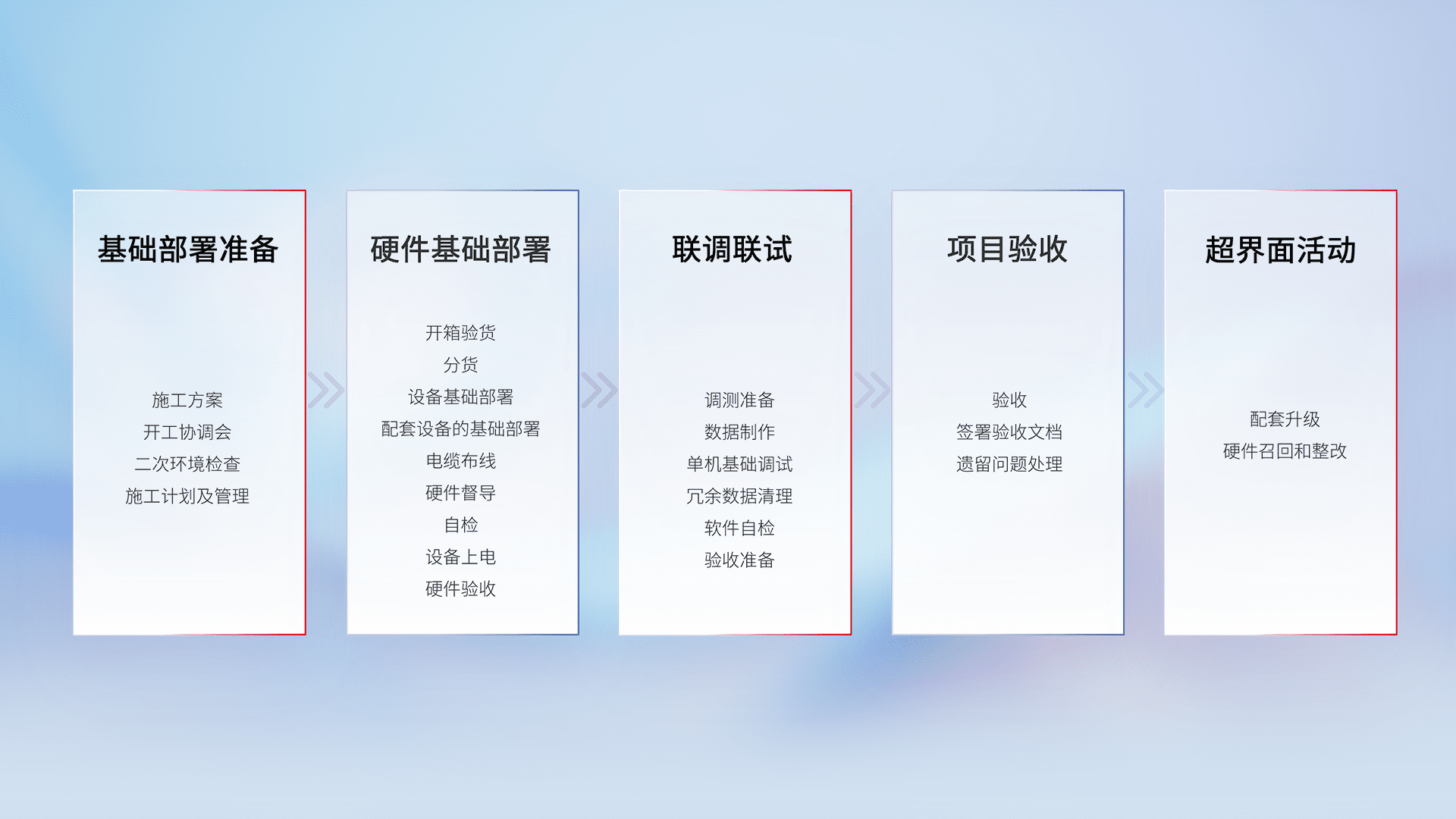 从基础部署准备、、、硬件基础部署、、、、联调联试、、、项目验收、、、、越界面活动的全过程可追溯,,保证施工质量和进度。。。。
