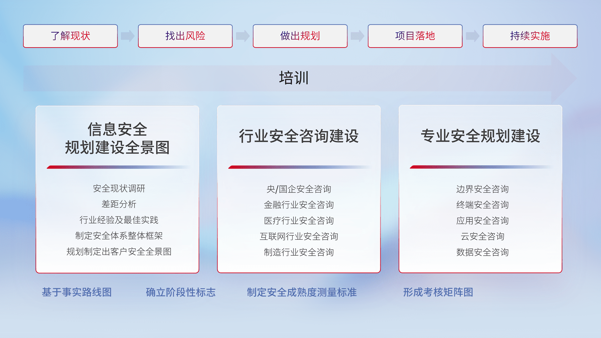 梳理客户信息安全现状调研、、差距分析结果,,结合行业先进经验及最佳实践,,,制订客户的信息安全管控体系总结架构,,,最终形成一个完整的客户信息安全规划与建设的全景图。。