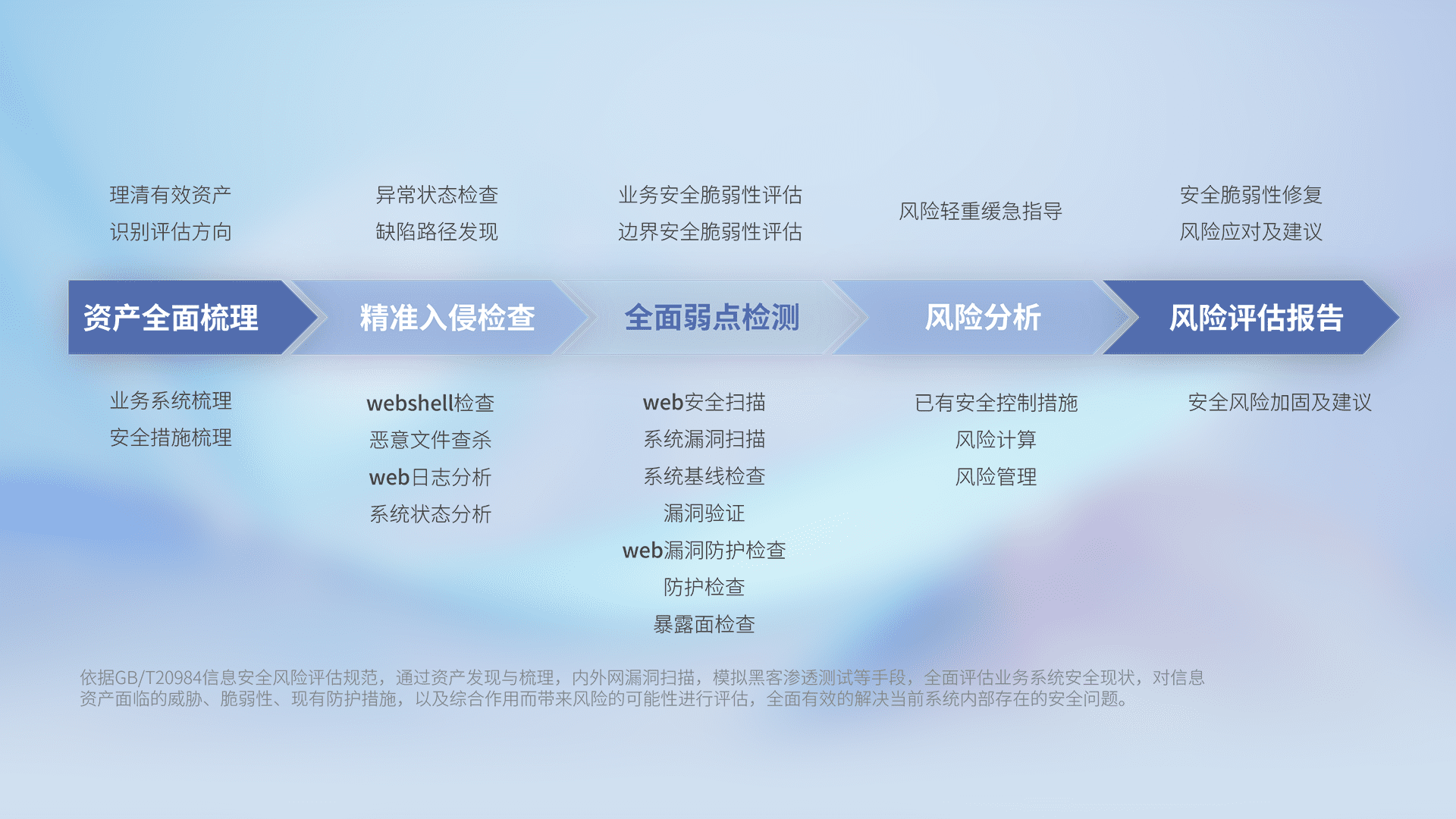 针对客户行业特性,,以专业的安全服务+多厂商联合解决方案提供专属的一站式安全管理服务,,,,帮助客户全面感知网络空间威胁,,,,基于识别、、、检测、、、分析、、防护、、、、监测、、响应的服务理论模型,,,从方案咨询、、、集成交付、、评估验证、、优化加固、、运维运营,,,致力于为客户提供完整的闭环管理式安全服务。。。以实战经验为客户打造高抵御风险的安全体系,,,帮助客户发现威胁、、对抗威胁、、处置威胁,,,不断积累安全对抗能力,,,持续保障数字化安全。。